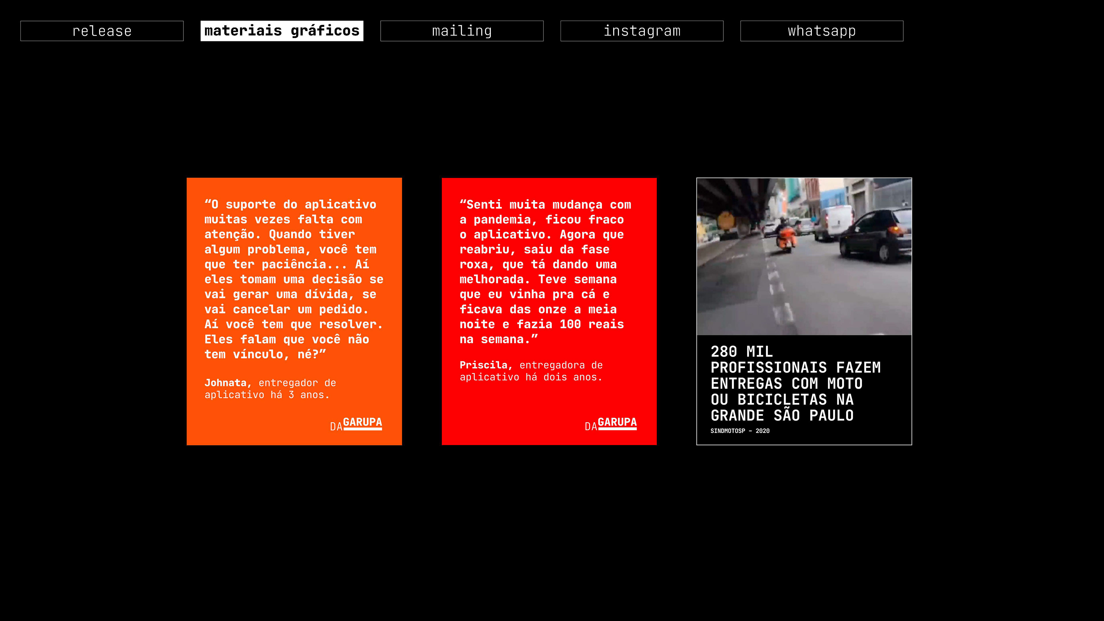 Given the context of mobilization and protest by the category, we sought to understand the reality of these professionals who took to the streets of São Paulo, carrying the demands of the isolated population up and down the streets, a population that knows little (or wants to know little) about those who make the system work. This gave rise to "DaGarupa", a project that seeks to bring app users and delivery professionals closer together, presenting the journeys of four workers who shared their stories through accounts and visual records.