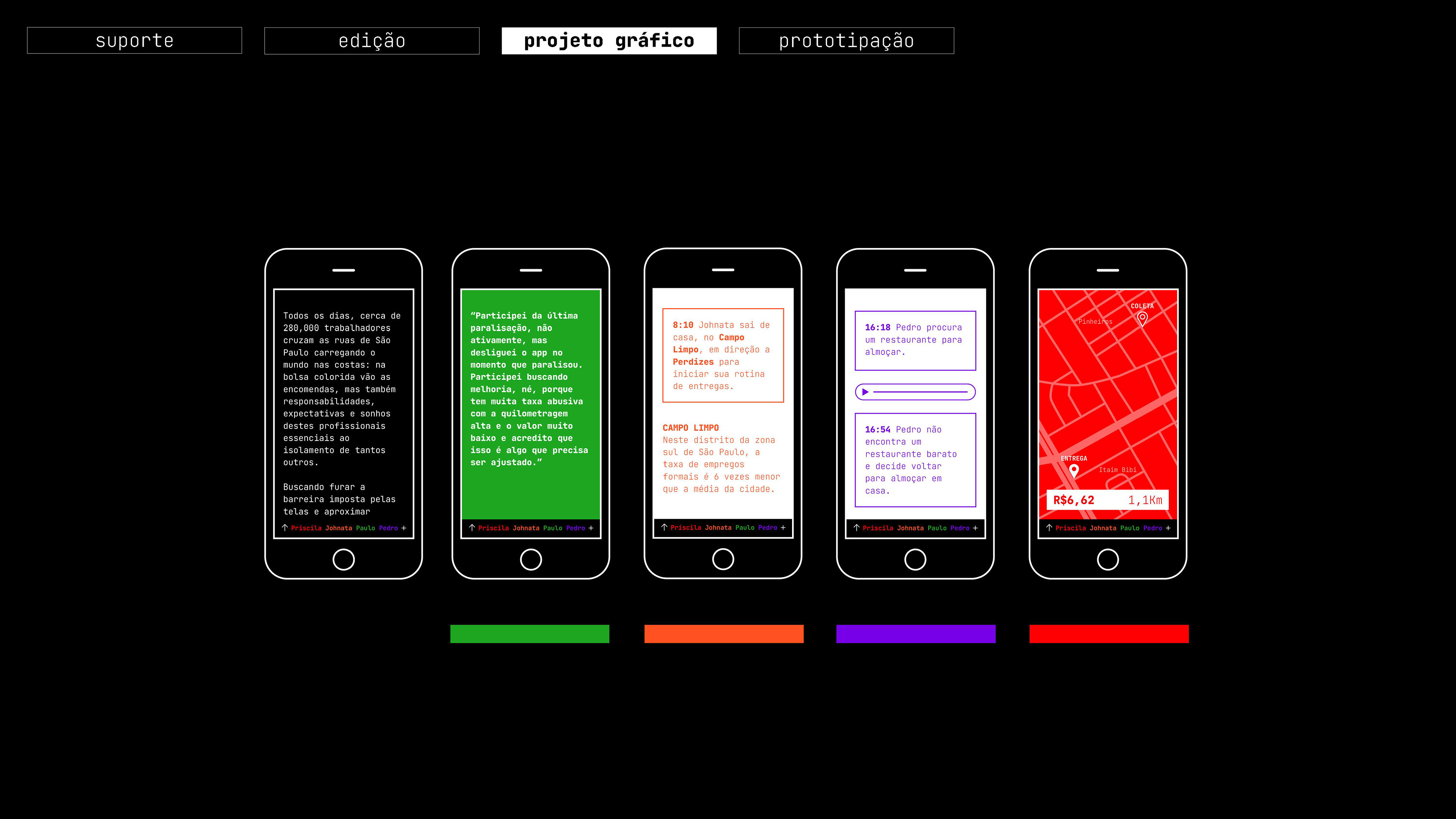 The chosen medium for displaying these diaries was the screen, where the entire relationship between delivery workers, restaurants, and customers takes place, always mediated by the apps. Screens were also the primary means of contact and information exchange among everyone involved in the project: from interviews to daily logs, all material was produced and shared using the phones that notified delivery requests.