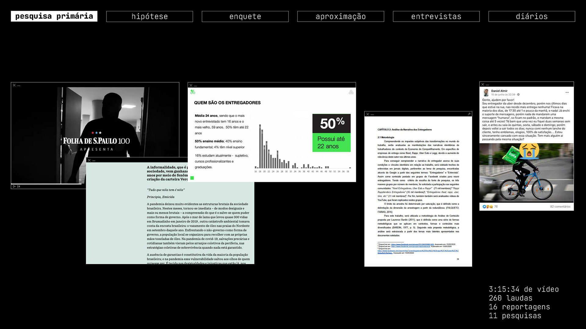 The project began with general research—in articles, reports, documentaries, and academic works—followed by exchanges with delivery workers through interviews and recordings of their work routines. For this last stage, which required more time and effort, we paid the people who shared their journeys, and the result was a series of multimedia diaries—photos, audios, videos, and text messages—recorded by the workers themselves throughout the day.